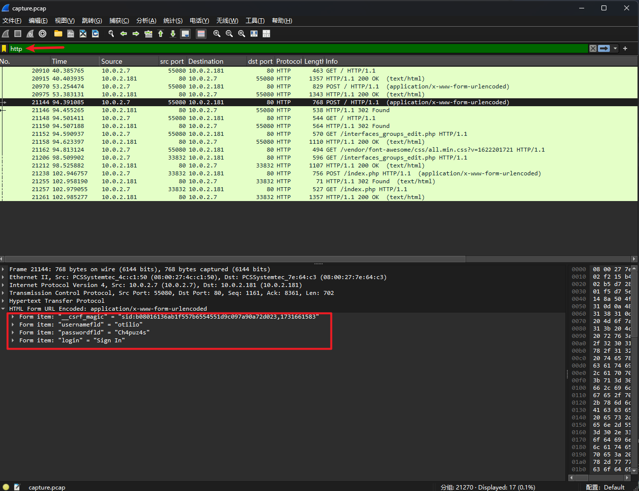接下来要找到登录口令。在靶机的解压缩包里,还有一个pcap文件,作者在靶机说明里也提示了这个Pcap文件,用wireshark打开,过滤http请示,可以找到登录口令。