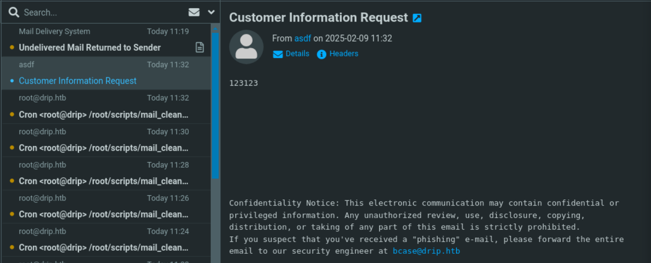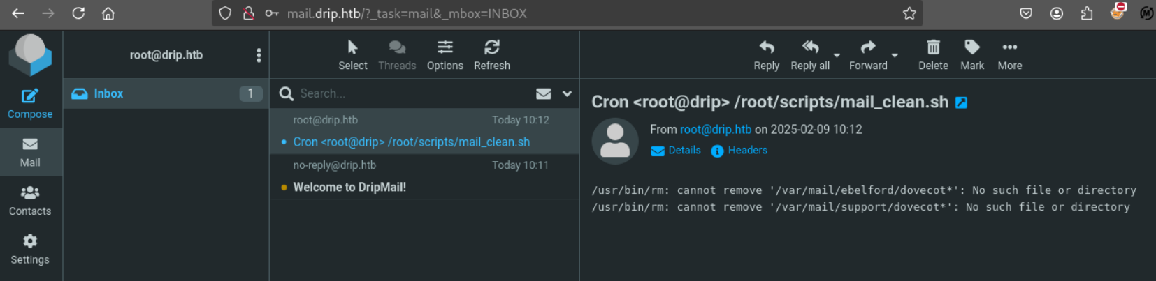 以root用户名注册后,进入mail.drip.htb(另忘也加入hosts),可以读取一封邮件。