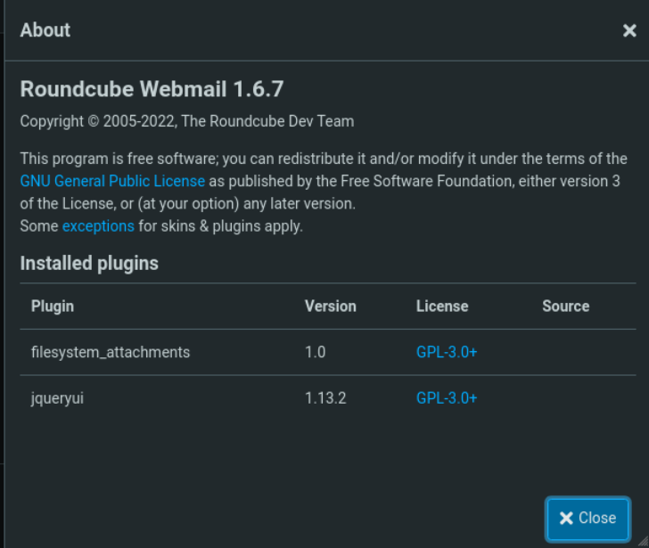在关于信息里,可以看到这个系统用的是Roundcube Webmail 1.6.7。