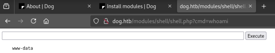 Your shell address: http://dog.htb/modules/shell/shell.php