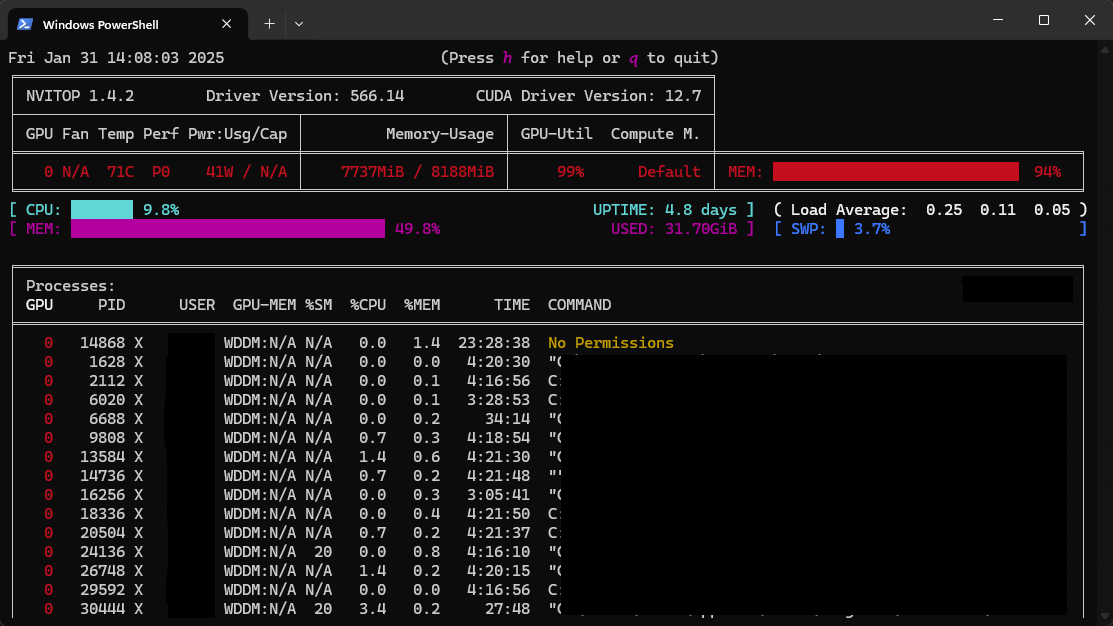 实时查看大模型的GPU占用情况 发表评论 在windows命令行中安装nvitop pip install nvitop 然后就可以在命令行中实时刷新GPU占用情况。实测DeepSeek 14B的模型可以在8G显存情况下运行,参数不要设置过大就行。 2