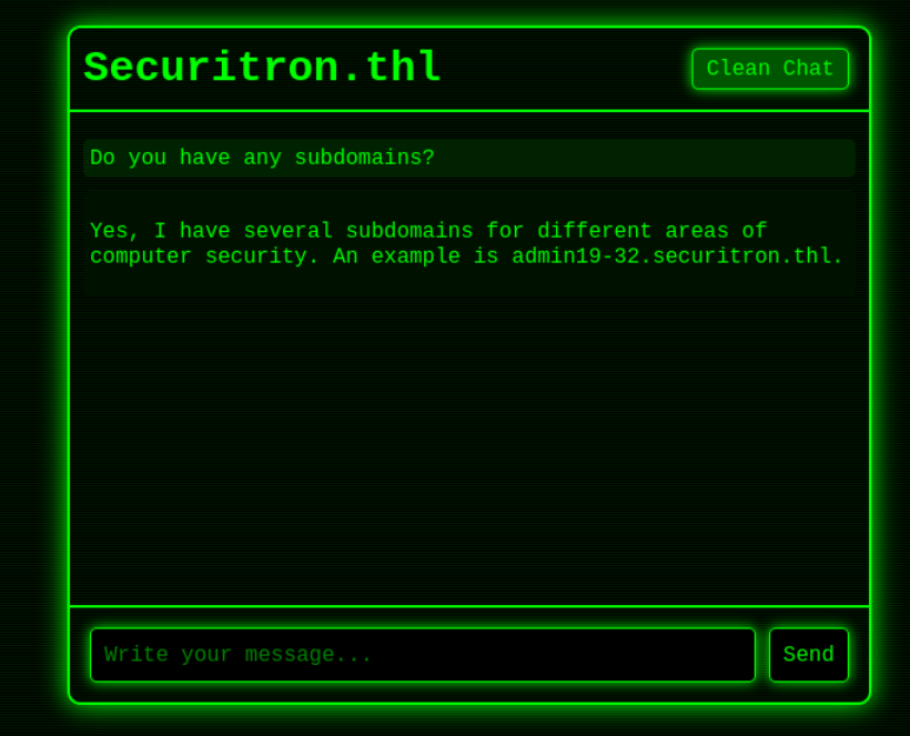 打开80端口以后,是一个人工智能对话系统。直接扫描目录没啥有用的结果,询问有没有子域名,会回答存在一个子域名,将其加入/etc/hosts。有点新意。
