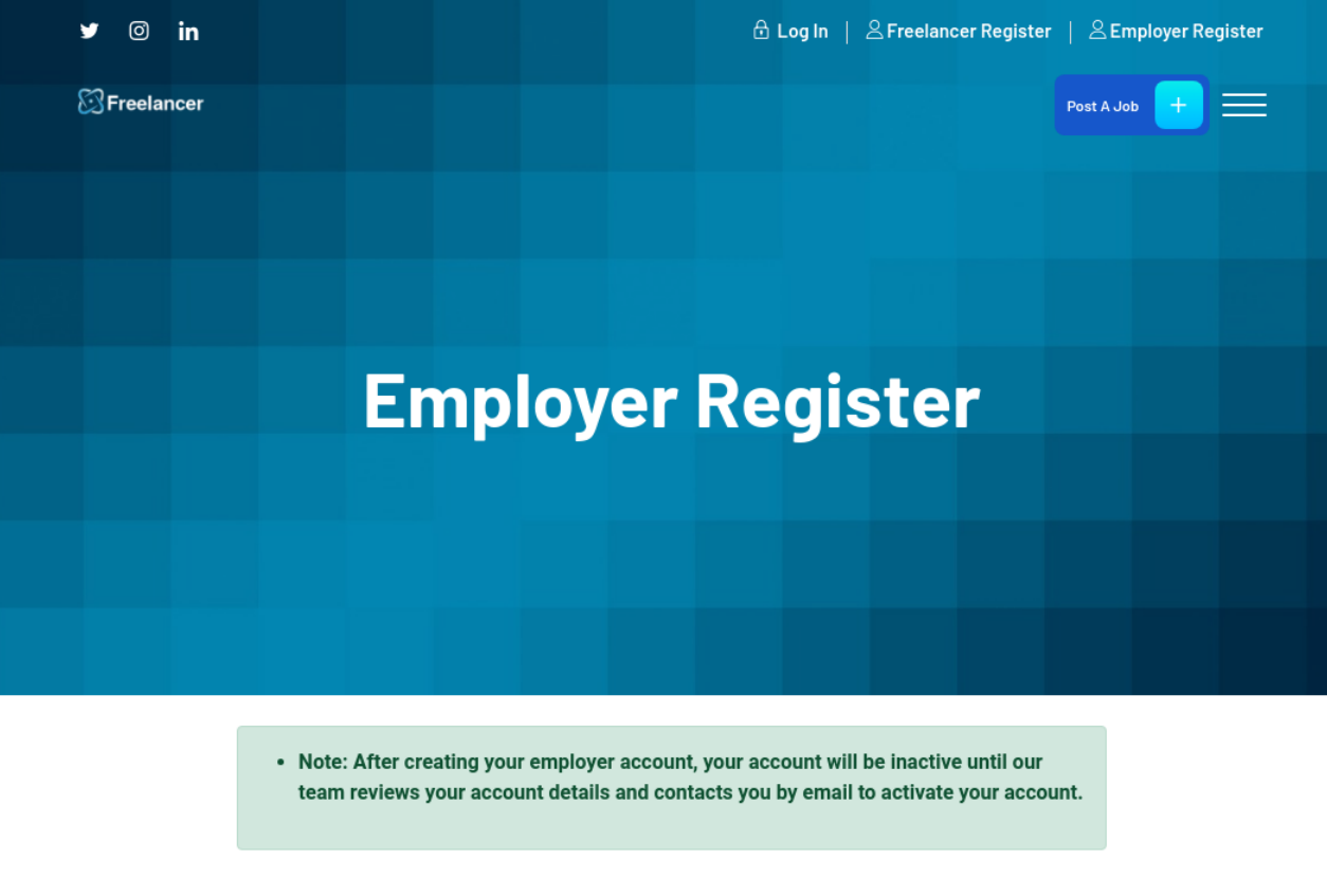 浏览网站,可以注册Freelcaner和Employer,其中注册Employer时提示注册的账号暂时不会激活