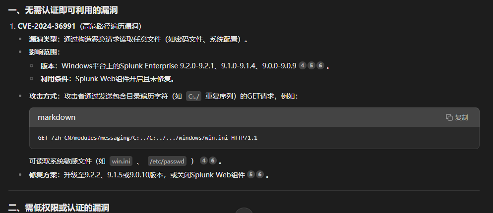 DeepSeek给出CVE-2024-36991是较新的无需登录可利用的漏洞。其中的...,表示多个C:..,需要用户自行尝试。